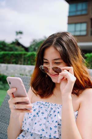 Close up asian woman on white shirt holding cup of coffee and using smartphone in nature.