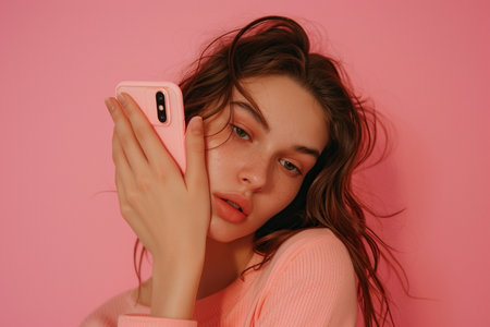 Closeup portrait of a womans face reflected on an iPhone screen against a vibrant pink background
