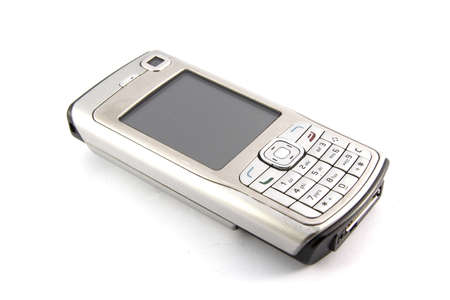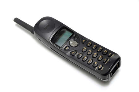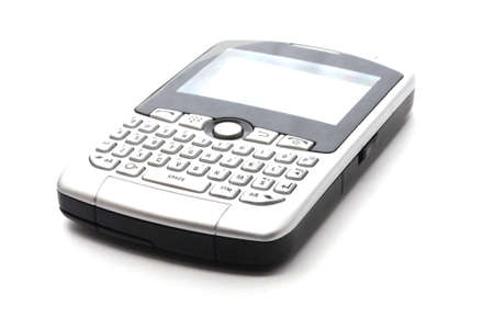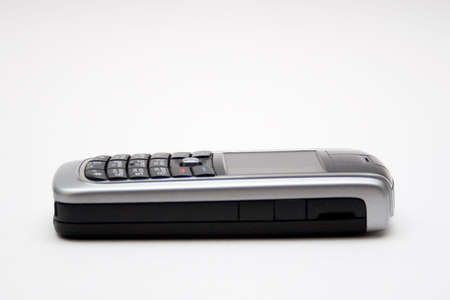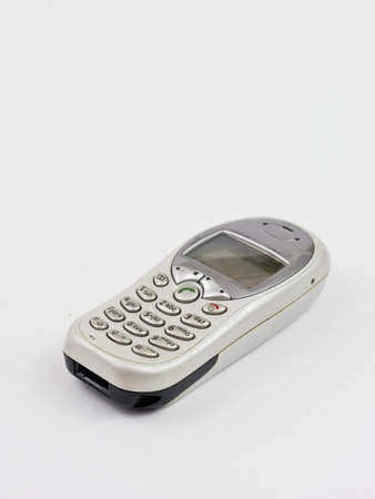 cellphone of silver color with antenna, english and russian letters on buttons isolated over white