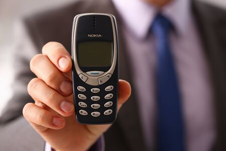 Minsk, Belarus - November 29, 2019: Male arm holding Samsung s 10 and Nokia 3310 cellphone