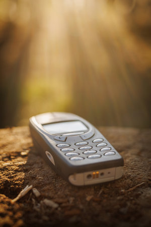 Old mobile phone on ground in warm sunlight