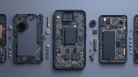 A detailed view of disassembled smartphone components arranged on a gray background. Each part reveals intricate circuitry, showcasing technology innovation and design.