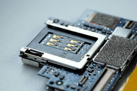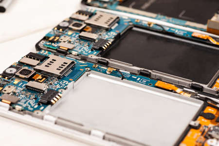 Dissasembled tablet, electronic circuit board, close-up of connectors and chips, science and technology background