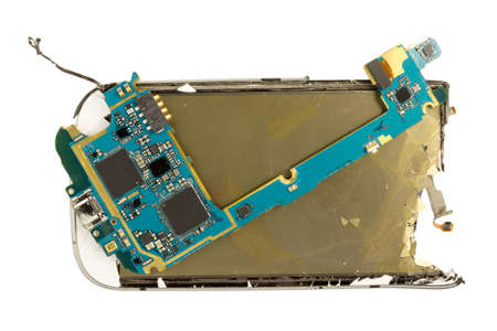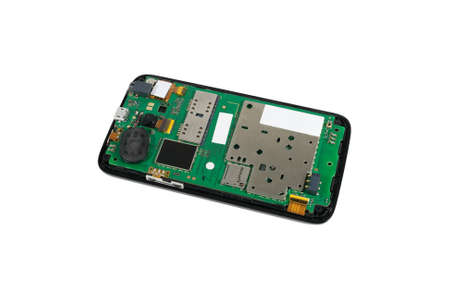 Dismantling a smartphone with an electrical panel inside, isolated on a white background