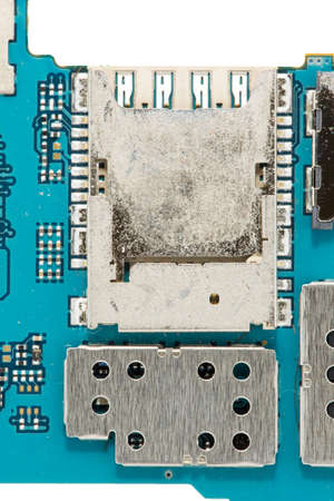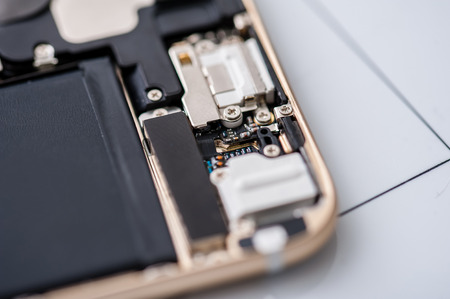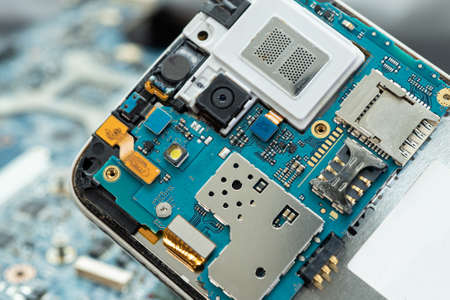 Close up of modern mobile phone repair process chip. Service for restoration and maintenance of smartphones