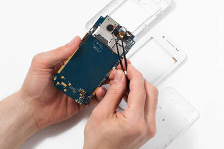 Repairman disassembling smartphone with tweezers.