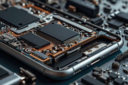 Explore a detailed view of a smartphone circuit board showcasing intricate components and advanced technology that powers modern devices.