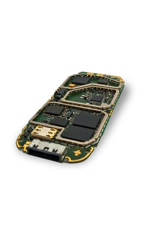Close-up of smartphone with circuit board. Technology and communication concept