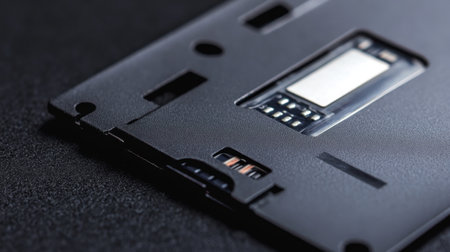 Detailed close-up of a black mobile phone back cover featuring a sim card slot and microchip components, showcasing modern technology and intricate design elements.