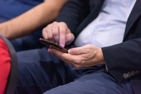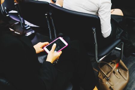 Group of people using smart phones sitting at the meeting, close up on hands.