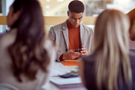 Group of students watching smartphones. Young people addiction to new technology trends.