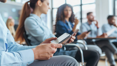 Social media is everywhere, even in a seminar room. a group of businesspeople using their mobile phones during a conference.
