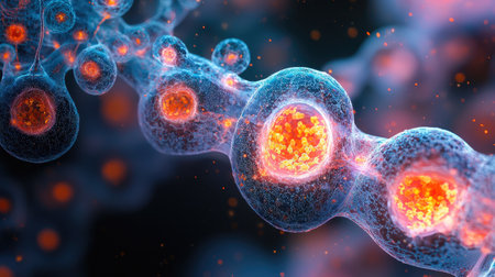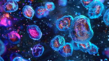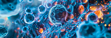 Intricate world of living cells in this closeup, showcasing glowing organic structures on a stunning blue background, revealing lives microscopic beauty