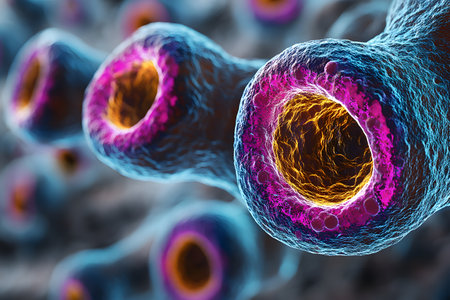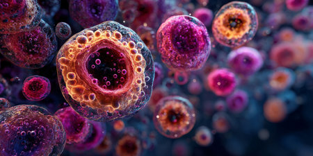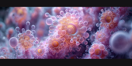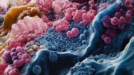 Abstract Microscopic View of Cells and Tissues with Vibrant Colors and Intricate Patterns in Scientific Art. Banner. Copy space. Background.