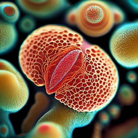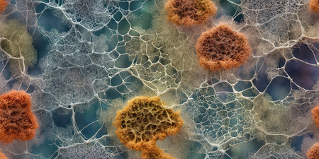 This vibrant image showcases abstract cellular structures captured through microscopy, highlighting intricate details and patterns significant in biological research and education.
