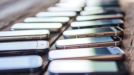 Group of mobile phones on a wooden table. Focus on the foreground.