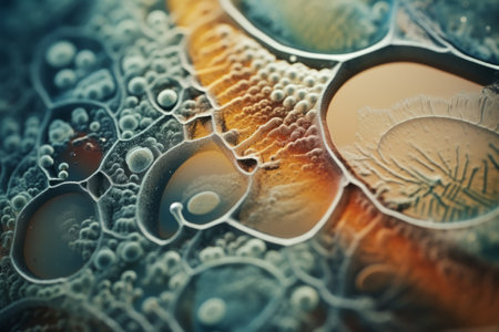 Macro shot of microbes cells and bacteria, 3d microscopic virus close up, abstract background or fantasy wallpaper, by ai generative