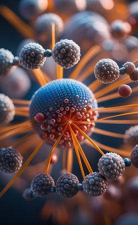 This vivid abstract illustration showcases colorful molecular structures, creating a dynamic and artistic representation perfect for science and technology themes.