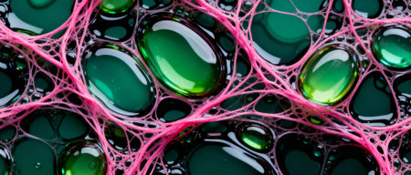 Abstract green liquid bubbles encased in intricate pink web like structures showcasing vibrant science inspired organic patterns.