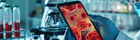 Scientist with phone displaying cells, lab background, focus on screen, modern research.