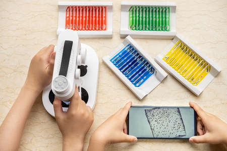 kids using an electrical microscope and seeing the enlarge photo on a mobile