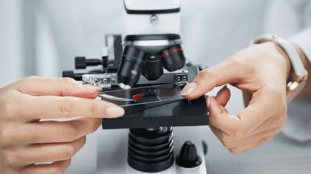 Close up crop view of scientist hands putting microscope glasses in special store box.