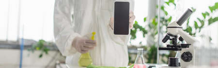 partial view of scientist holding smartphone with blank screen near flask and microscope, banner