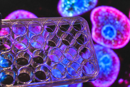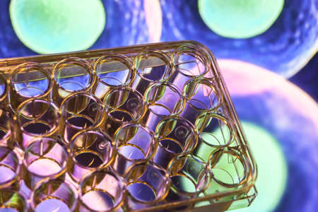 Achievements of modern biological science. A 24-well cell culture plate against an abstract biological background.