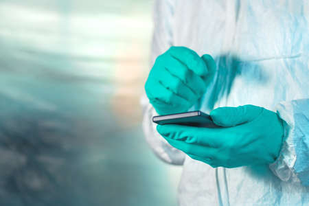 Epidemiologist using smartphone in quarantine, conceptual image with selective focus