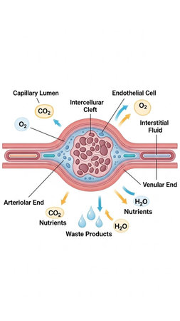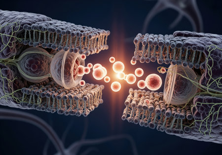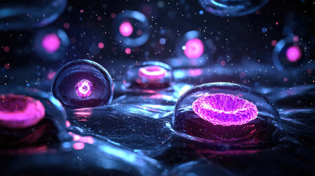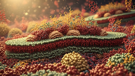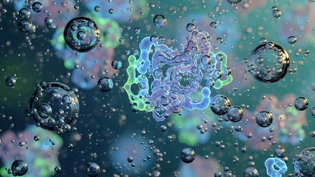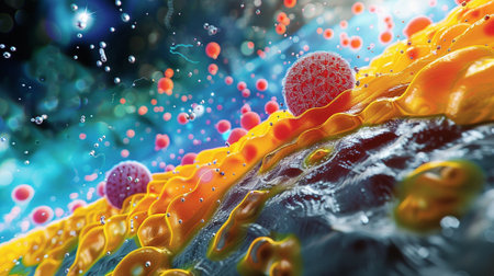 A vibrant and colorful abstract visualization of cellular structures and molecules interacting with a fluid environment, showcasing intricate biological processes.
