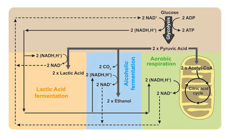 Glycolysis, Aerobic Respiration And Anaerobic Fermentation In One Scheme. Colorful Symbols. Vector Illustration.