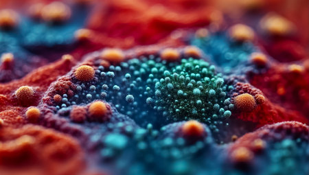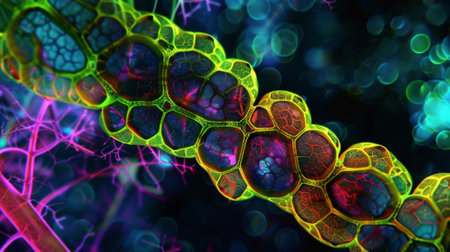 A captivating close-up reveals diverse cellular structures, showing a colorful mix of shapes and sizes. These vivid formations highlight the complexity of microscopic life.