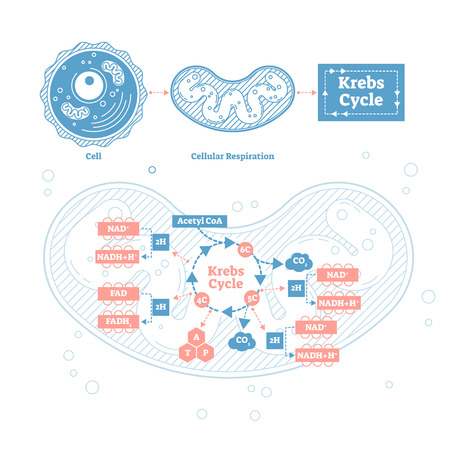 Krebs cycle vector illustration. Cellular respiration labeled outline scheme. Educational diagram with cell, cellular respiration and ATP. Human power molecular metabolism.