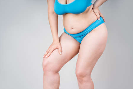 Overweight thigh, woman with fat hips and buttocks, obesity female body with cellulite on gray background, studio shot