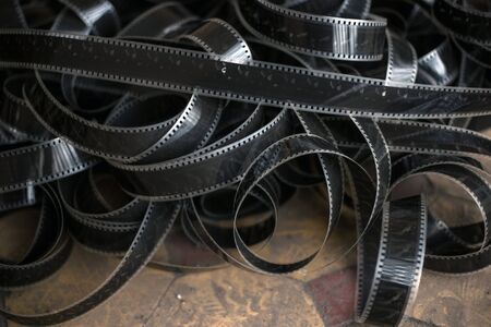 Black swirling strips of old analog film with scratches and scuffs. Photo or video film for films or pictures close up. The concept of retro cinematography, photography, photographic memories.