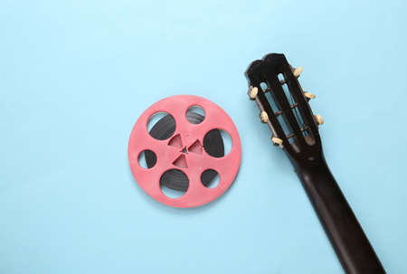 Acoustic guitar and audio reel on blue background. musical concept. minimalism. top view. flat lay