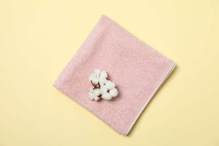 Towel and cotton flower on beige background, top view