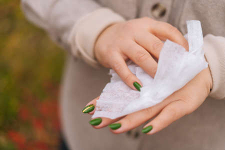 Close-up cropped shot of unrecognizable woman disinfecting and cleaning hands with antibacterial wet wipes outdoors. Closeup of female wiping hands with napkin outside in city street.