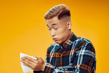 Asian car in a plaid shirt with a napkin in his hand on a yellow background