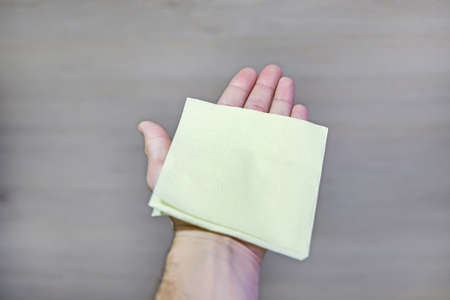 Close-up of hand gesture holding napkin neatly in middle with fingers on yellow background. Hand disinfection or virus control. Way to throw away used napkin. Paper crafts or shadow theater.