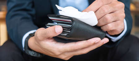 Businessman in suit cleaning money wallet by wet wipes tissue and alcohol disinfectant at office or cafe, protection coronavirus (Covid-19) infection. New Normal and Clean surface concept