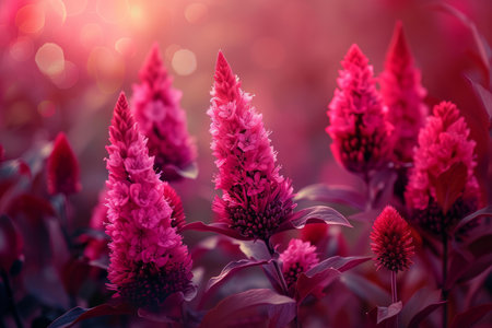 Vibrant pink celosia flowers bask in the ethereal glow of a sunset