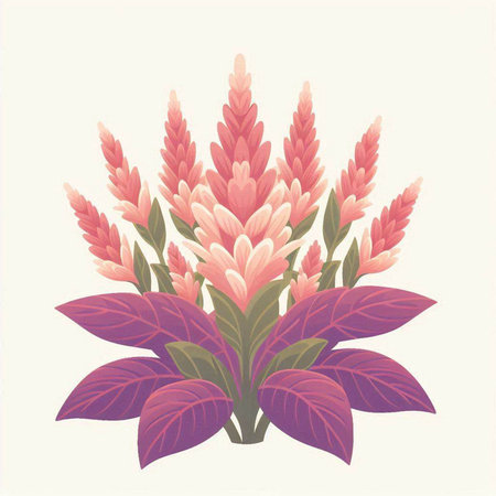 Bright purple cockscomb (Celosia Caracas) flowers on a bed of green leaves and stalks -01