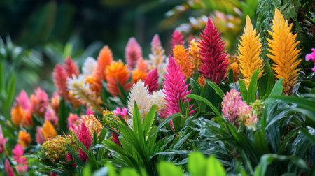 A field of ginger flowers in multiple colors growing in harmony with other tropical plants.