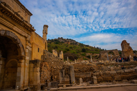 Awesome view of the Gate of Augustus and the Library of Celsus in Ephesus (Efes). Ruins of the ancient Greek city in Selcuk, Izmir Province, Turkey. Ephesus is a popular tourist attraction in Turkey.