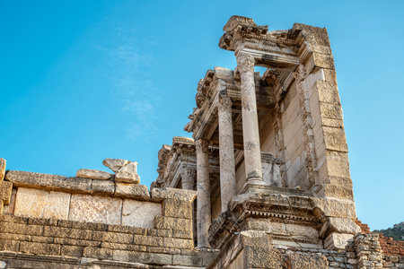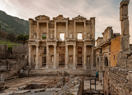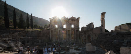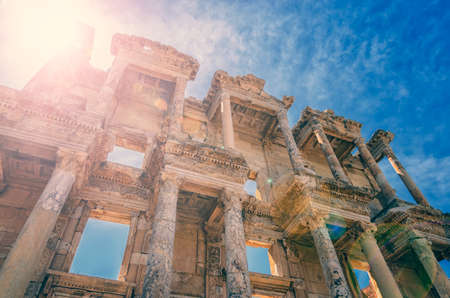 The ruins of Celsus Library in Ephesus at sunny evening sun. Beautiful light of the old ancient rocks and stones, turkey