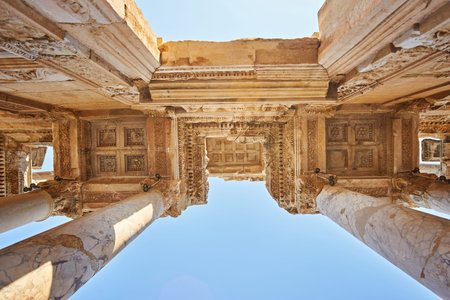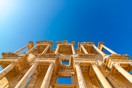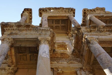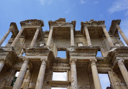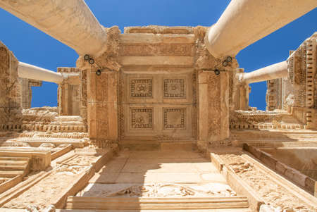 Celsus libraries against the blue sky in Ephesus, Turkey. Bottom up view