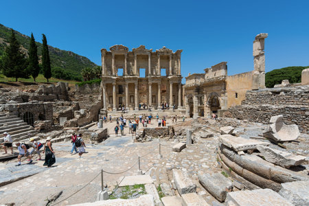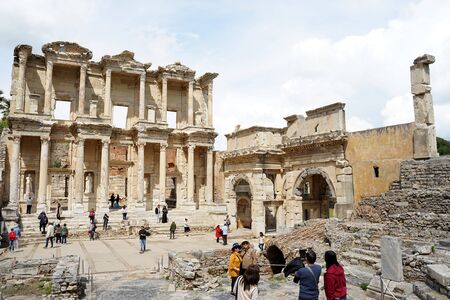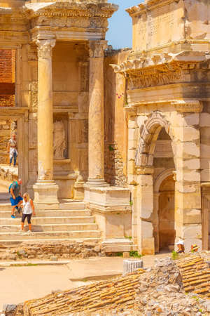Kusadasi, Turkey - April 28, 2019: People visiting Celsus Library and old ruins of Ephesus or Efes famous site