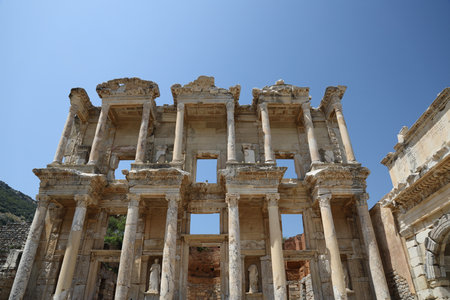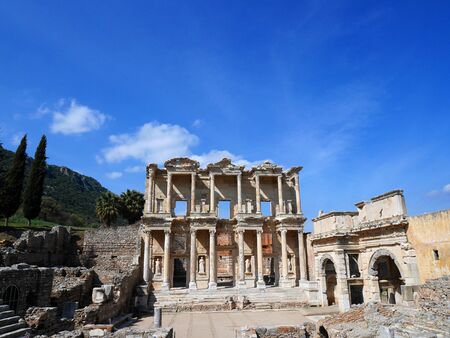Visit Turkey concept. Celsus Library with clear blue sky. Ephesus ruins in Izmir.