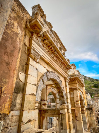 Weathered beige stone columns flank a grand arched portal on the Library of Celsus facade, with intricate carvings crowning the entablature against scattered clouds and distant green hills. Ornate details in acanthus motifs and recessed niches capture the enduring Roman engineering in Ephesus.